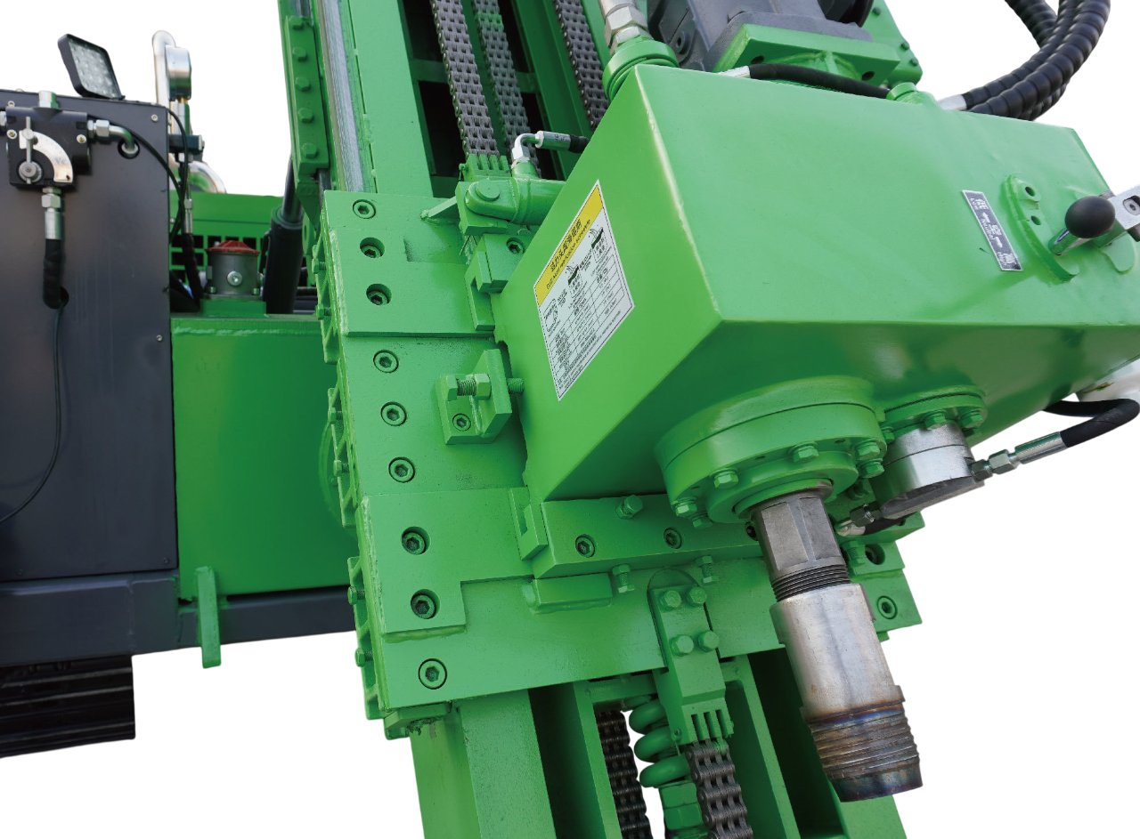The rig adopts a full hydraulic drive system using an axial piston pump combined with auxiliary hydraulic pumps to ensure smooth power transmission and efficient hydraulic output. The power head features a mechanical two-speed stepless speed regulation design, enabling precise adjustment of rotary speed and torque to match different rock formations. A lateral translation mechanism on the power head simplifies drill rod lifting and lowering, improving operational efficiency and safety.